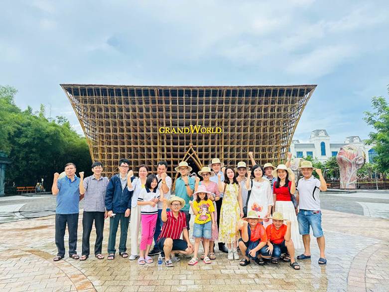 Tập thể giảng viên và gia đình Khoa Kinh tế - Luật hào hứng check-in tại công trình kiến trúc tre độc đáo, biểu tượng của Grand World