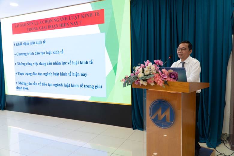 Tham luận thứ nhất với tiêu đề: Đào tạo cử nhân ngành luật kinh tế theo định hướng nghề nghiệp, ứng dụng – thực trạng và giải pháp – TS. Nguyễn Tú, Khoa Kinh tế - Luật, Trường đại học Tài chính – Marketing